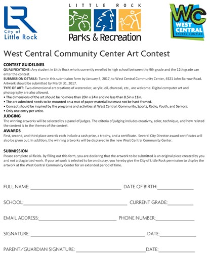 Any student at a public or private school in Little Rock who is currently enrolled in high school (grades 9 – 12) is eligible to enter. The deadline for entering is Jan. 4, 2017. Submission forms can be mailed to West Central Community Center at 4521 John Barrow Road.