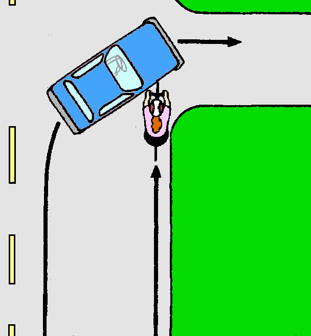 Figure 1. A "right hook" occurs when a vehicle turns right immediately in front of a bicycle traveling straight, causing the bicycle to crash into the car. One way this type of crash can occur is at an intersection, when the person on the bike does not move into the center of the right-most lane allowing straight movement. In this case, the driver does not account for the bicyclist resulting in a crash. Image from http://john-s-allen.com.