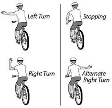 When riding a bike on the road or trail, one of the most important things you can do to avoid a crash is to be predictable. Motorists share their intentions with turn signals and brake lights. You can communicate the same information with hand signals (Figs. 1 & 2).
