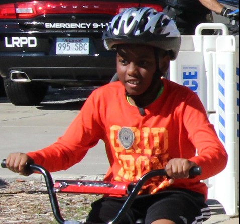 Figure 1. Rider sporting a well fitting helmet at Bike with a Cop event at the new 12th St. LRPD Precinct in October 2016.