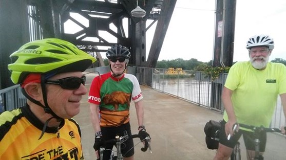 Figure 2. Arkansas Bicycle Club riders on the Clinton Presidential Bridge. Little Rock bike clubs typically will not allow participation in their rides without bike helmets.