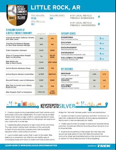 In May 2016, the League of American Bicyclists designated Little Rock a Bike Friendly Community at the Bronze (entry) level. They also included a report card to indicate the most effective next steps for Little Rock to become more bike friendly. The League has guided hundreds of communities through this process. These recommendations, tailored to our community's strengths and challenges, can help identify and prioritize our next steps to improving our city for bicyclists. Click on report card (left) for an expanded view.