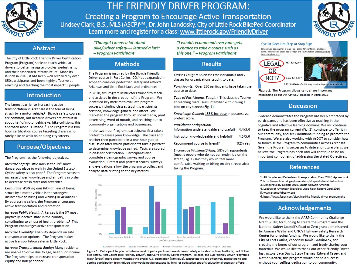Friendly Driver: While this overlaps with Enforcement, this course, launched in 2018 through funding from AARP's Community Challenge Grant, is targeted at people who primarily drive on Little Rock streets, to help them better understand their legal rights and responsibilities around bicyclists and pedestrians. One of the first programs of its kind, based on the Bike Friendly Driver Program developed in Fort Collins, the highly effective Little Rock Friendly Driver Program has gotten considerable attention through posters at conferences of the Arkansas Public Health Association (2019) and the Association of Pedestrian and Bicycle Professionals (ABPB, 2019), a panel at APBP (2019), an America Walks State Walking Networks teleconference (2019), and an upcoming panel at LAB's National Bike Summit (2020). Through this exposure, we are helping several cities across the country launch similar programs based on Little Rock's Friendly Driver Program and we are talking with the Arkansas DOT about launching the program statewide.