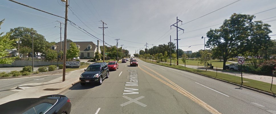 Figure 6. Markham is a dangerous street to cross on bike or on foot without a traffic light (Google streetview close to the intersection of Van Buren and Markham).