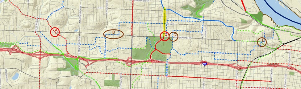 Figure 7. Our Master Bike Plan proposes few options to cross Markham. A) The Rodney Parham/Markham intersection is very busy, but if quality bike facilities can be constructed on both sides, it will represent an important, rare north-south crossing of Markham. B) only the most hardened bicyclist (Latent Demand Figs. 4 & 5) would ride without separated facilities on Markham between Hughes and McKinnley. This route may require reexamination, C) This is the Fair Park/Markham/Van Buren intersection. It has a traffic light to facilitate crossing and now has bike lanes on both sides of Markham, D) the proposed Monroe St. crossing has no traffic light to stop W. Markham St. traffic. This crossing may require reexamination, E) The Barton/W. Markham crossing has no traffic light to stop W. Markham St. traffic and sightlines are obscured by a bend in the road. This crossing may require reexamination. The new Master Complete Streets Plan must consider better, more frequent W. Markham St. crossings.