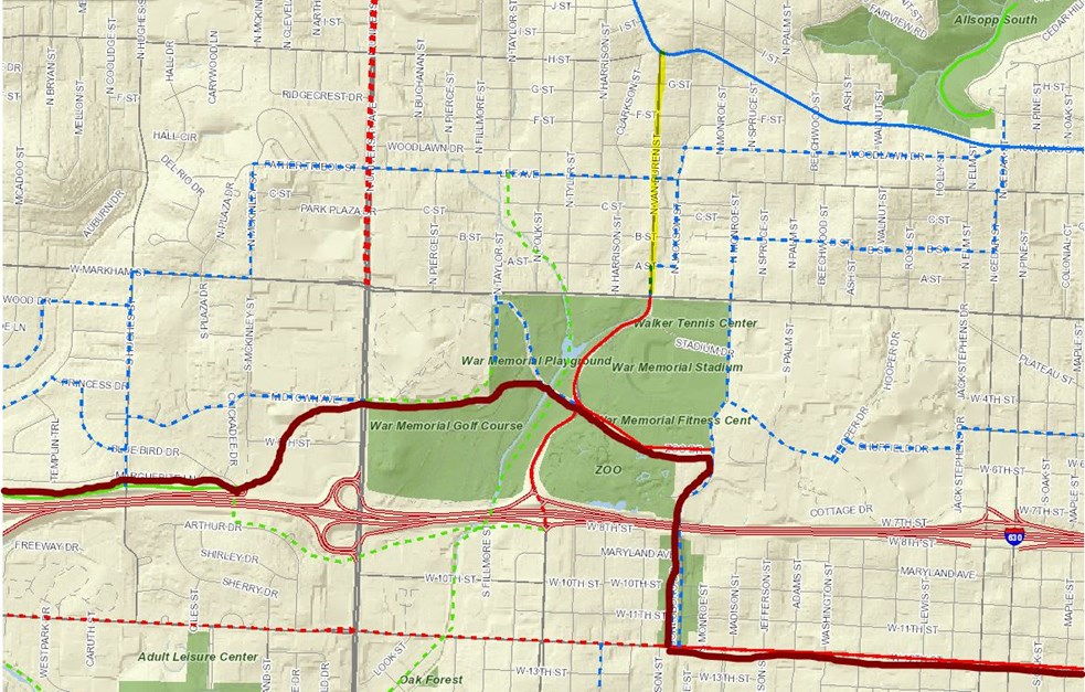 W. Markham St. is a formidable crossing barrier for people using our street network on bike. It is a four lane, high speed, high traffic count street (21,000 ADT close to the Markham/Van Buren intersection) with rolling hills that obscure motorist sightlines and few traffic lights to slow traffic or facilitate crossing (Fig. 6). W. Markham presents such a challenge for bicycle connectivity that our Master Bike Plan proposes few crossings, and most of the proposed crossings are arguably dangerous (Fig. 7). New bike crossing signs on Markham at the Fair Park/Van Buren intersection increase the safety of this crossing (Fig. 8). The installation of bike lanes on Van Buren creates only the second bike corridor to cross Markham/3rd in all of Little Rock (State St. has sharrows that cross 3rd St.).