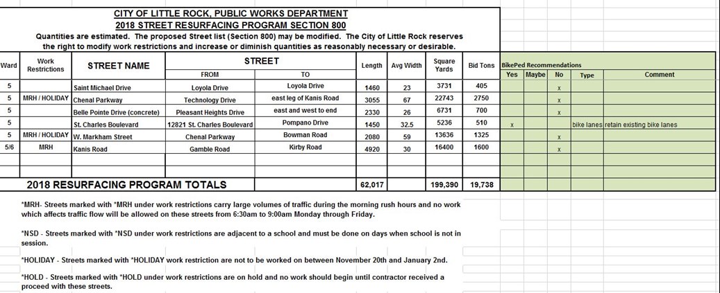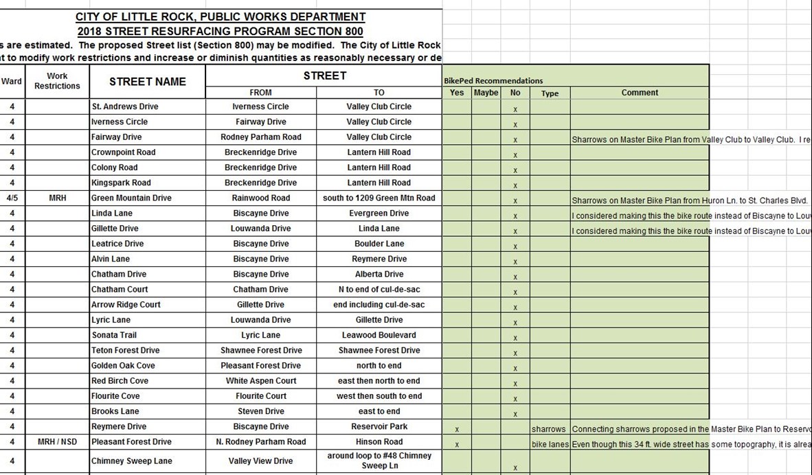 Figure 1. 2018 resurfacing projects in Ward 4 and BikePed Coordinator recommendations for bike facilities (green). I recommended that sharrows not be installed on Fairway Dr., even though the Master Bike Plan calls for them, because this short section would not make a connection.