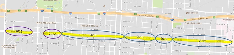 Figure 9. 12th Street road resurfacing projects between November 2012 and May 2013. Blue circles represent road diets, purple circles kept four lane configuration.