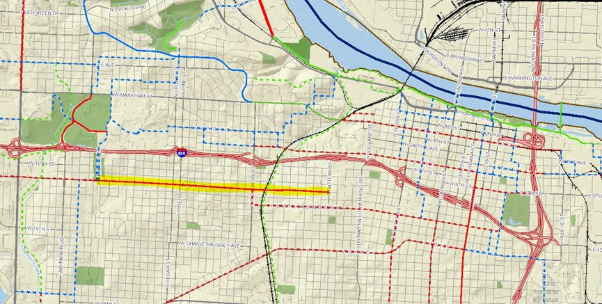 Figure 7. This present-day map of the proposed (dashed) and installed (solid) Master Bike Plan shows the importance of 12th St. (highlighted yellow) as an important east-west bike connector and that we still have work ahead to implement bicycle connectivity.