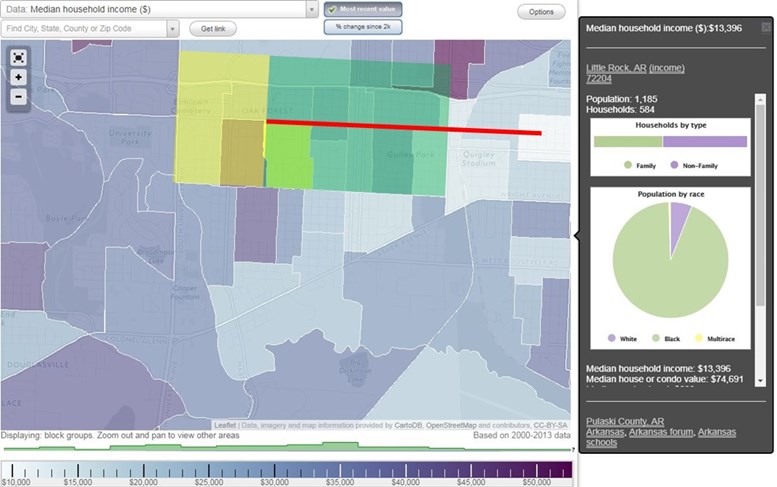 Figure 4. The Corridor where the road diet (red line) was implemented (green box) and where it wasn’t implemented (yellow box) superimposed on a demographic map of race and income. Map from city-data.com.