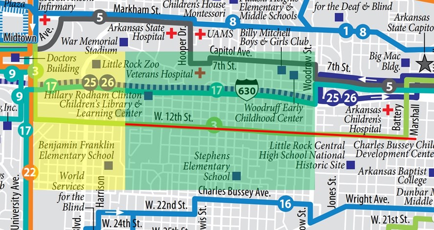 Figure 6. Route 3 is the only Rock Region Metro route to serve the Corridor (Routes 17, 25, and 26 have no access on freeway). Making pedestrian and bicycle travel along 12th St. safer facilitates access to transit. Yellow box is Corridor not served by road diet, green box is Corridor served by road diet, and red line is road diet.