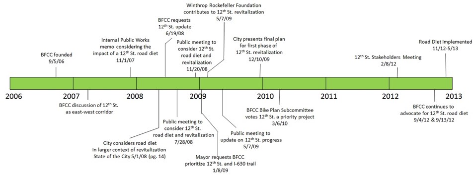 Figure 8. A timeline of the events leading to the 12th St. road diet implementation. A special thanks to BFCC Voting Member Ken Gould for compiling this history.
