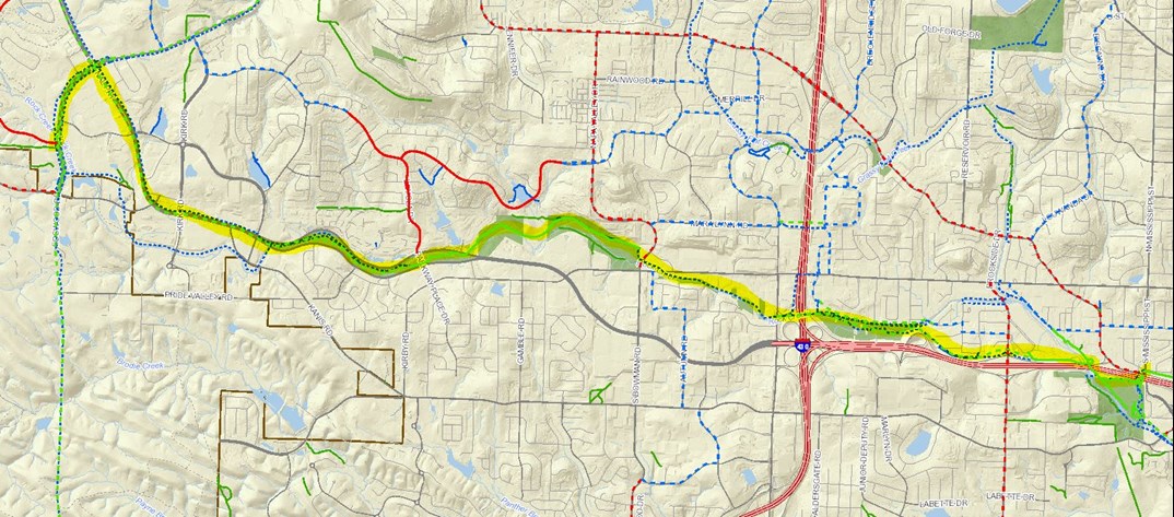 Figure 6. Rock Creek could provide a corridor to extend this trail network west. Trail segments from Kanis Park to Henderson Middle School, from Bowman Rd. to Parkway Place Dr., and from Rahling Rd. to Denny Rd. already exist.