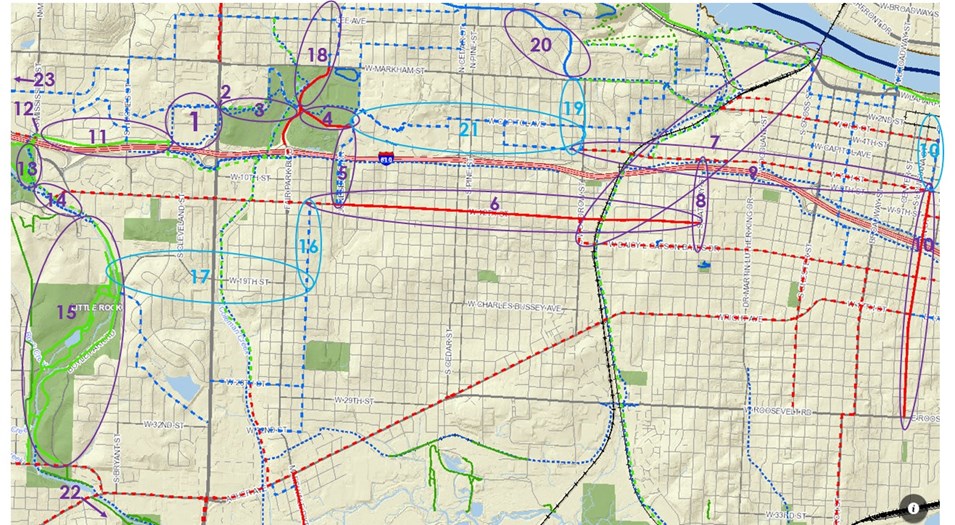 1) The District at Midtown: The City of Little Rock is in discussions with the developer of the property where Sears used to be to either construct a bicycle and pedestrian around their new development. Contact Mark Webre MWebre@littlerock.gov for more information.