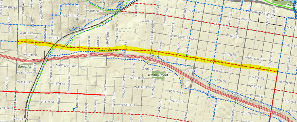 2) Southwest Trail: The Southwest Trail/Central High Corridor will intersect 7th St. Pedestrians could access the trail from bus routes or from Stifft Station, Capitol Hill, or Arkansas Children’s Hospital if sidewalk facilities were adequate.