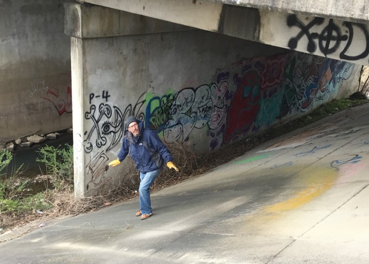 Figure 1. Bicycle advocate Paul Norris demonstrates one potential solution to cross Kanis Rd., crossing under Kanis Rd. at Rock Creek.