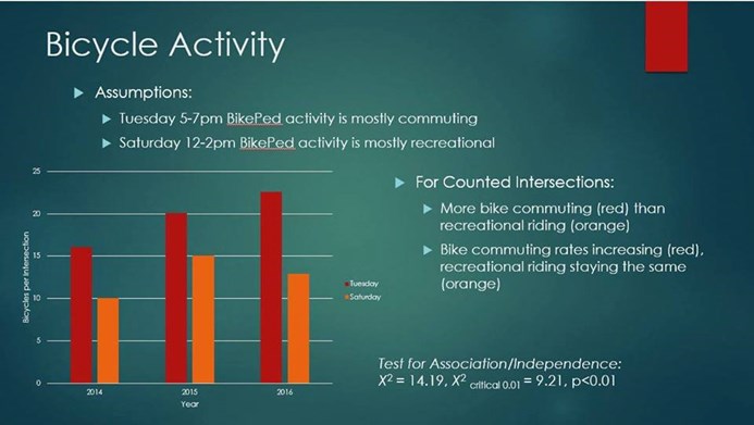 The last count was in September 2016; I am still compiling those data. The counts were done on a Tuesday from 5-7pm (which presumably captures commuters) and on a Saturday from 12-2pm (which primarily captures recreational BikePed activity). Preliminary analysis of the last three years shows some surprising results: