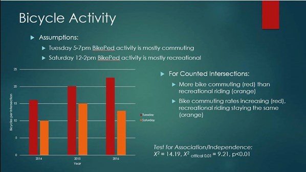 Figure 2. Data from our annual bicycle and pedestrian count, done in mid-September, show that people are biking (and walking - data not shown) and that bike commuting (red bars) may be increasing in Little Rock.