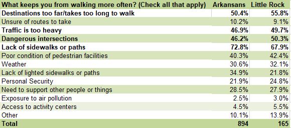 Table 2. The importance of various walking disincentives for Arkansans and Little Rock residents as a percentage of those who chose "High" when given the choices of High, Medium, or Low (modification of Arkansas Bicycle and Pedestrian Transportation Plan #25, pg. A-11).