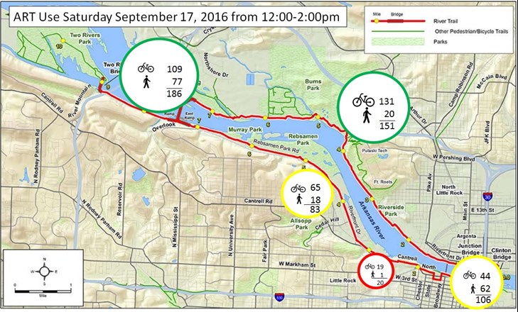 Figure 3. Little Rock residents and guests choose to walk and bike where our built facilities protect them from vehicular traffic and do not walk or bike nearly as much when those facilities are absent.