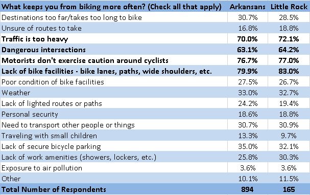 However, it's also true that Little Rock's bicycle commuting rate is low relative to other cities in the U.S. Why is that? The Metroplan community outreach data above provides some insight (i.e. our built environment does not support it) but a more recent community outreach effort goes farther. An ArDOT survey associated with Arkansas Bicycle and Pedestrian Transportation Plan asked Arkansans about their walking and biking patterns and what factors influence them. ArDOT generously provided the City of Little Rock those raw data, allowing us to consider the responses from Little Rock residents (Table 1).