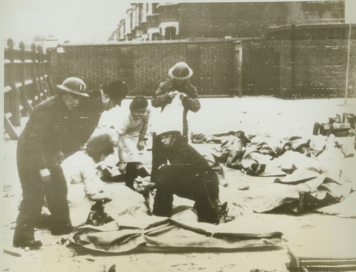 Girls Clear London Bomber Debris, 1/18/1943. LONDON - London girls sweep up shattered glass and the slight debris outside of a department store which was damaged during the feeble Nazi aerial atteck on January 17. The Nazis scarcely damaged the British Capital in their weak retaliation for the devastating RAF raids on Berlin.; Photo cabled from London to New York today.; Full DJH; Credit (ACME cablephoto); 1/18/43;