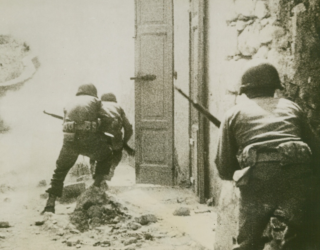 AND ONE WAS HIT (#1), 5/17/1944. ITALY—This is the first photo in a dramatic sequence made in an unnamed Italian village as three U.S. scouts fought a building-to-building scrap against entrenched Nazis. Here the trio moves cautiously down the street as a fourth scout watches them go and is prepared to cover the rear.Credit: Signal Corps newsreel photo from Acme;