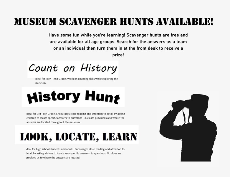 Scavenger hunts help focus your visit to the museum and add a little fun to learning! Three scavenger hunts are available with varying levels of difficulty. Each one encourages attention to detail and emphasizes close reading. Scavenger hunts are perfect for teams of students or for individuals and everyone gets a prize!